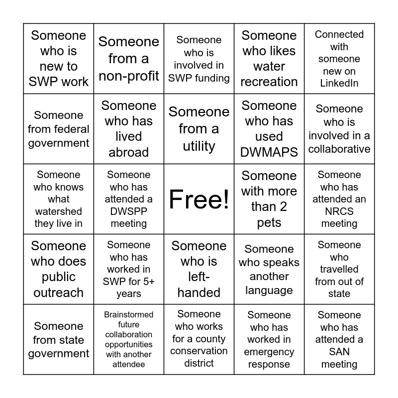 This bingo card has a free space and 24 words: Someone who has worked in SWP for 5+ years, Brainstormed future collaboration opportunities with another attendee, Someone from a utility, Someone from state government, Connected with someone new on LinkedIn, Someone who is new to SWP work, Someone from federal government, Someone from a non-profit, Someone with more than 2 pets, Someone who is left-handed, Someone who has used DWMAPS, Someone who knows what watershed they live in, Someone who speaks another language, Someone who travelled from out of state, Someone who has lived abroad, Someone who has worked in emergency response, Someone who has attended an NRCS meeting, Someone who is involved in SWP funding, Someone who is involved in a collaborative, Someone who has attended a DWSPP meeting, Someone who has attended a SAN meeting, Someone who does public outreach, Someone who likes water recreation and Someone who works for a county conservation district.