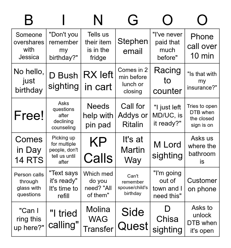 This bingo card has 36 words: Can't remember spouse/child's birthday, Which med do you need? "All of them", Side Quest, No hello, just birthday, Comes in Day 14 RTS, Call for Addys or Ritalin, D Bush sighting, Molina WAG Transfer, "I've never paid that much before", "I'm going out of town and I need this", "Is that with my insurance?", Stephen email, Customer on phone, Asks questions after declining counseling, Comes in 2 min before lunch or closing, Someone overshares with Jessica, Person calls through glass with questions, "I just left MD/UC, is it ready?", Free!, Tells us their item is in the fridge, Needs help with pin pad, Picking up for multiple people, don't tell us until after, It's at Martin Way, KP Calls, M Lord sighting, "Don't you remember my birthday?", Racing to counter, "I tried calling", RX left in cart, Phone call over 10 min, Asks to unlock DTB when it's open, "Can I ring this up here?", Asks us where the bathroom is, Tries to open DTB when the closed sign is on, "Text says it's ready" It's time to refill and D Chisa sighting.