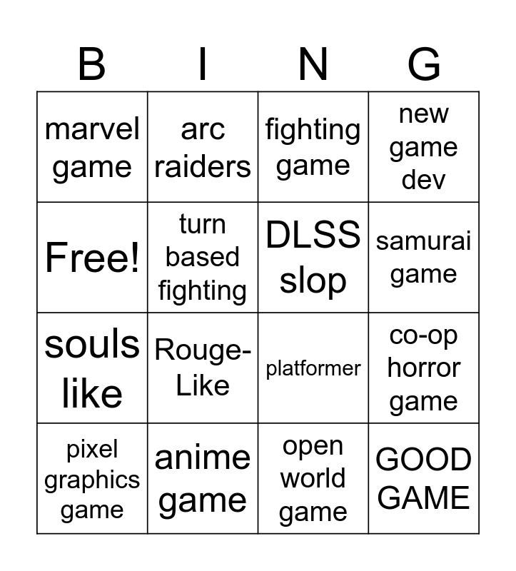 This bingo card has 16 words: anime game, co-op horror game, fighting game, marvel game, souls like, arc raiders, platformer, open world game, Free!, turn based fighting, pixel graphics game, new game dev, Rouge-Like, samurai game, DLSS slop and GOOD GAME.