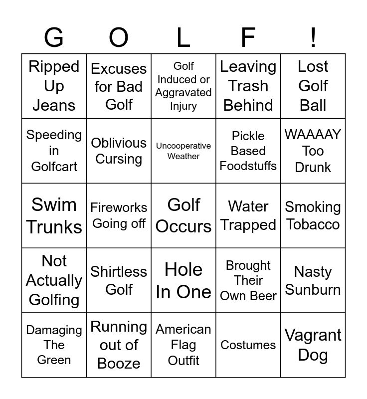 This bingo card has a free space and 24 words: Shirtless Golf, Running out of Booze, Uncooperative Weather, Damaging The Green, Lost Golf Ball, Ripped Up Jeans, Speeding in Golfcart, Excuses for Bad Golf, Water Trapped, Hole In One, Pickle Based Foodstuffs, Swim Trunks, Brought Their Own Beer, Nasty Sunburn, Oblivious Cursing, Costumes, Smoking Tobacco, Golf Induced or Aggravated Injury, WAAAAY Too Drunk, Fireworks Going off, Vagrant Dog, Not Actually Golfing, Leaving Trash Behind and American Flag Outfit.