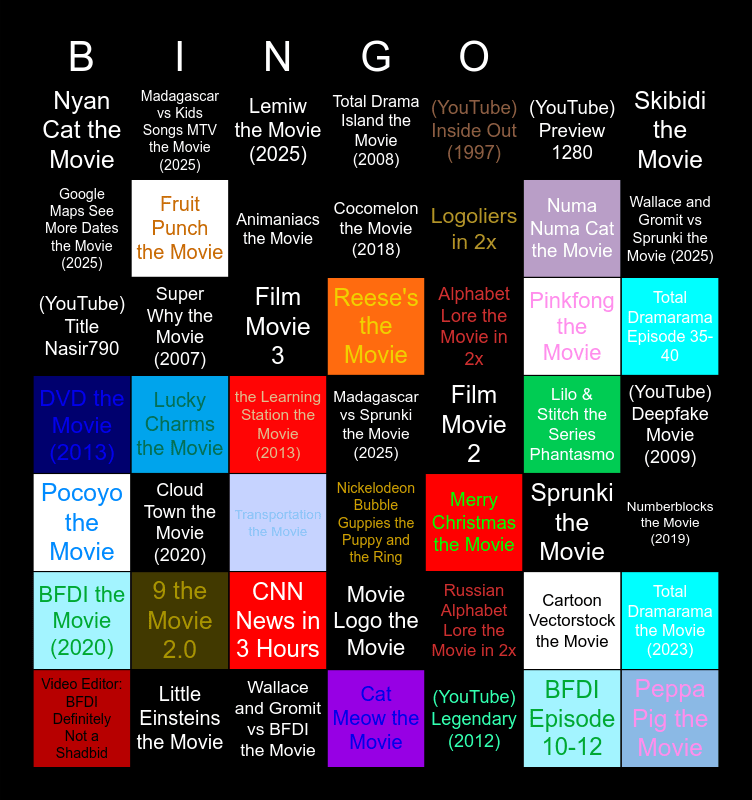 This bingo card has 74 words: Film Movie, Sprunki the Movie, Lemiw the Movie (2025), CNN News in 3 Hours, Octonauts the Movie, TAWOG the Movie (2011), Nickelodeon Bubble Guppies the Puppy and the Ring, BFDI Episode 10-12, Total Dramarama Episode 35-40, HTF Episode 3-12, 72, 75 & 11c Ending Credits, Lilo & Stitch the Series Phantasmo, Kids Songs MTV, Google Maps See More Dates the Movie (2025), (YouTube) Preview 1280, Big Pumpkin the Movie, Logoliers in 2x, Madagascar vs Sprunki the Movie (2025), Animaniacs the Movie, Wallace and Gromit Grand Adventures in 2x, Cocomelon the Movie (2018), Skibidi the Movie, Madagascar vs Kids Songs MTV the Movie (2025), Total Drama Island the Movie (2008), (YouTube) Deepfake Movie (2009), Numa Numa Cat the Movie, Little Einsteins the Movie, Cartoon Vectorstock the Movie, Video Editor: BFDI Definitely Not a Shadbid, BFDI vs Sprunki the Movie, (YouTube) Legendary (2012), (YouTube) Inside Out (1997), (YouTube) Lightyear (2009), Wallace and Gromit vs BFDI the Movie (2025), Happy Halloween Movie, Transportation the Movie, the Learning Station the Movie (2013), PJ Masks the Movie (2016), Lego the Movie, 9 the Movie 2.0, BFDI the Movie (2020), Lucky Charms the Movie, DVD the Movie (2013), Cat Meow the Movie, Drama Days the Movie, BFDI vs Kids Songs MTV the Movie, Nyan Cat the Movie, Film Movie 2, Film Movie 3, Film Movie 4, Merry Christmas the Movie, Wallace and Gromit vs BFDI the Movie, Jack Hartmann the Movie, (YouTube) Title Nasir790, Movie Logo the Movie, Wallace and Gromit vs Kids Songs MTV the Movie, Oreo the Movie, Reese's the Movie, Pocoyo the Movie, Peppa Pig the Movie, Pinkfong the Movie, Fruit Punch the Movie, Bob the Train the Movie, Super Why the Movie (2007), Numberblocks the Movie (2019), Wallace and Gromit vs Sprunki the Movie (2025), Cloud Town the Movie (2020), HTF the Movie (2006), Total Dramarama the Movie (2023), Alphabet Lore the Movie in 2x, Russian Alphabet Lore the Movie in 2x, Spanish Alphabet Lore the Movie in 2x, McDonald's Commercial Logo History, Jesse and Mike the Movie (2021) and Annoying Orange the Movie.