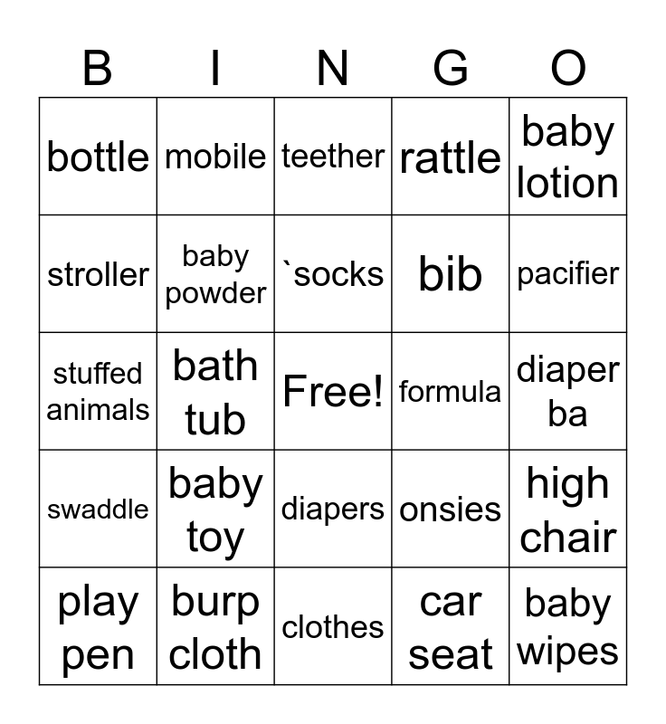 This bingo card has a free space and 24 words: baby toy, burp cloth, `socks, play pen, baby lotion, bottle, stroller, mobile, formula, diapers, bib, stuffed animals, onsies, high chair, baby powder, car seat, diaper ba, teether, pacifier, bath tub, baby wipes, swaddle, rattle and clothes.