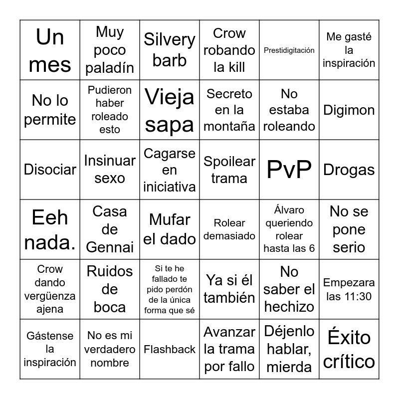 This bingo card has 36 words: Ya si él también, Si te he fallado te pido perdón de la única forma que sé, Avanzar la trama por fallo, No lo permite, Eeh nada., Spoilear trama, Pudieron haber roleado esto, Flashback, Prestidigitación, No saber el hechizo, Digimon, Crow robando la kill, Empezara las 11:30, Insinuar sexo, Secreto en la montaña, Un mes, Crow dando vergüenza ajena, PvP, Disociar, Silvery barb, Cagarse en iniciativa, Casa de Gennai, Rolear demasiado, Mufar el dado, Álvaro queriendo rolear hasta las 6, Muy poco paladín, No estaba roleando, No es mi verdadero nombre, Vieja sapa, Me gasté la inspiración, Éxito crítico, Gástense la inspiración, No se pone serio, Drogas, Ruidos de boca and Déjenlo hablar, mierda.