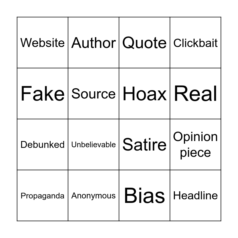This bingo card has 18 words: Unbelievable, Headline, Quote, Website, Satire, Clickbait, Propaganda, Author, Real, Debunked, Bias, Fake, Opinion piece, Source, Hoax, Image, Anonymous and Advertisement.