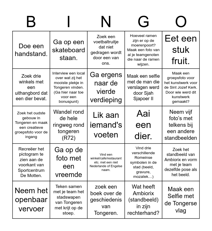 This bingo card has a free space and 24 words: Neem het openbaar vervoer, Ga op de foto met een vreemde, Ga ergens naar de vierde verdieping, Wat heeft Ambiorix (standbeeld) in zijn rechterhand?, Eet een stuk fruit., Doe een handstand., Ga op een skateboard staan., Zoek een voetbaltruitje dat niet gedragen wordt door een van ons., Aai een dier., Neem vijf foto’s met telkens bij een andere standbeelden, Zoek het oudste gebouw in Tongeren en maak een creatieve groepsfoto voor de ingang, Interview een local over wat zij het mooiste plekje in Tongeren vinden. (Ga hier naar toe voor een bonuspunt), Vind drie verschillende Romeinse symbolen in de stad (beeld, gravure, mozaïek…), Zoek het standbeeld van Ambiorix en vorm met je team dezelfde pose als het beeld., Zoek drie winkels met een uithangbord dat een dier bevat., Teken samen met je team het stadswapen van Tongeren met krijt op de stoep., zoek een boek over de geschiedenis van Tongeren., Hoeveel ramen zijn er op de moerenpoort? Maak een foto van al je teamgenoten die naar de ramen wijzen., Maak een groepsfoto voor het kunstwerk voor de Sint Jozef Kerk. Door wie werd dit kunstwerk gemaakt?, Recreëer het pictogram te zien aan de voorkant van Sportcentrum De Motten., Wandel rond de hele ringweg rond tongeren (R72), Vind een winkel/cafe/restaurant etc. met een niet Nederlande of Engelse naam., Maak een selfie met de man die verslagen werd door Sjah Sjapoer II and Maak een Selfie met de Tongerse vlag.