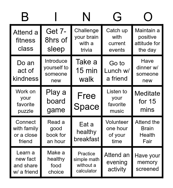 This bingo card has a free space and 24 words: Read a good book for an hour, Make a healthy food choice, Take a 15 min walk, Learn a new fact and share w/ a friend, Maintain a positive attitude for the day, Attend a fitness class, Do an act of kindness, Get 7-8hrs of sleep, Listen to your favorite music, Eat a healthy breakfast, Go to Lunch w/ a friend, Work on your favorite puzzle, Volunteer one hour of your time, Attend the Brain Health Fair, Introduce yourself to someone new, Attend an evening activity, Meditate for 15 mins, Challenge your brain with a trivia, Have dinner w/ someone new, Play a board game, Have your memory screened, Connect with family or a close friend, Catch up with current events and Practice simple math without a calculator.