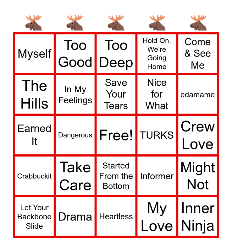 This bingo card has a free space and 35 words: God’s Plan, One Dance, Hotline Bling, In My Feelings, Started From the Bottom, Hold On, We’re Going Home, The Hills, Can’t Feel My Face, Save Your Tears, Die For You, Earned It, Come & See Me, Get You, Figures, Myself, TURKS, My Love, Dangerous, Crabbuckit, Inner Ninja, Informer, Let Your Backbone Slide, Might Not, Drama, Too Deep, edamame, Love No More, Attachments, Nice for What, Crew Love, Passionfruit, Heartless, Take Care, Too Good and You Can Have It All.