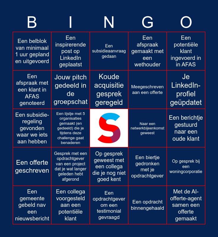 This bingo card has a free space and 24 words: Gesprek met een opdrachtgever van een project dat je wat langer geleden hebt afgerond, Een collega voorgesteld aan een potentiële klant, Koude acquisitie gesprek geregeld, Een gemeente gebeld nav een nieuwsbericht, Een potentiële klant ingevoerd in in AFAS, Een belblok van minimaal 1 uur gepland en uitgevoerd, Een afspraak met een klant in AFAS genoteerd, Een inspirerende post op LinkedIn geplaatst, Naar een netwerkbijeenkomst geweest, Op gesprek geweest met een collega die je nog niet goed kent, Meegeschreven aan een offerte, Een subsidie-regeling gevonden waar we iets aan hebben, Een biertje gedronken met je opdrachtgever, Op gesprek bij een woningcorporatie, Jouw pitch gedeeld in de groepschat, Een opdracht binnengehaald, Een berichtje gestuurd naar een oude klant, Een subsidieaanvraag gedaan, Je LinkedIn-profiel geüpdatet, Een lijstje met 5 organisaties gemaakt (en gedeeld) die je tijdens deze challenge gaat benaderen, Met de AI-offerte-agent samen een offerte gemaakt, Een offerte geschreven, Een afspraak gemaakt met een wethouder and Een opdrachtgever om een testimonial gevraagd.