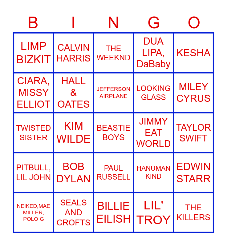 This bingo card has 48 words: BAD BUNNY, BEASTIE BOYS, BENSON BOONE, BILLIE EILISH, BOB DYLAN, BRUNO MARS, CALVIN HARRIS, CASSIE, CIARA, MISSY ELLIOT, CREEDENCE CLEARWATER REVIVAL, HALL & OATES, DUA LIPA, DaBaby, EDWIN STARR, HANUMAN KIND, HARRY STYLES, JACK HARLOW, JEFFERSON AIRPLANE, JIMMY EAT WORLD, JOHN MAYER, KESHA, KIM WILDE, LIL' TROY, LIMP BIZKIT, LOOKING GLASS, LUDACRIS, MILEY CYRUS, NEIKED,MAE MILLER, POLO G, NINE INCH NAILS, PAUL RUSSELL, PITBULL, LIL JOHN, RAGE AGAINST THE MACHINE, ROSÉ, BRUNO MARS, SABRINA CARPENTER, SEAN PAUL, SEALS AND CROFTS, SUBLIME, TATE MCRAE, TAYLOR SWIFT, TEDDY SWIMS, THE BEATLES, THE BEATNUTS, THE KILLERS, THE WEEKND, TOMMY RICHMAN, TWISTED SISTER, TYLA, VANCE JOY and JAMES BROWN.