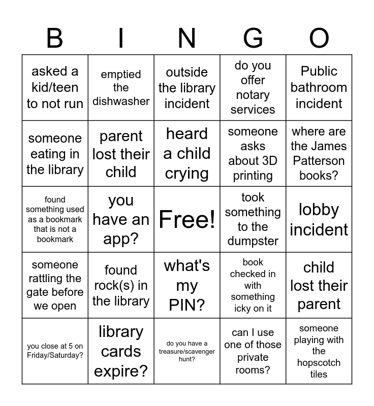 This bingo card has a free space and 24 words: found rock(s) in the library, library cards expire?, heard a child crying, you close at 5 on Friday/Saturday?, Public bathroom incident, asked a kid/teen to not run, someone eating in the library, emptied the dishwasher, took something to the dumpster, what's my PIN?, someone asks about 3D printing, found something used as a bookmark that is not a bookmark, book checked in with something icky on it, child lost their parent, parent lost their child, can I use one of those private rooms?, lobby incident, outside the library incident, where are the James Patterson books?, you have an app?, someone playing with the hopscotch tiles, someone rattling the gate before we open, do you offer notary services and do you have a treasure/scavenger hunt?.