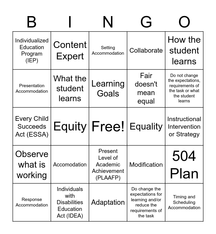 This bingo card has a free space and 24 words: Accomodation, Individuals with Disabilities Education Act (IDEA), Learning Goals, Response Accommodation, How the student learns, Individualized Education Program (IEP), Presentation Accommodation, Content Expert, Equality, Present Level of Academic Achievement (PLAAFP), Fair doesn't mean equal, Every Child Succeeds Act (ESSA), Modification, 504 Plan, What the student learns, Do change the expectations for learning and/or reduce the requirements of the task, Instructional Intervention or Strategy, Setting Accommodation, Do not change the expectations, requirements of the task or what the student learns, Equity, Timing and Scheduling Accommodation, Observe what is working, Collaborate and Adaptation.