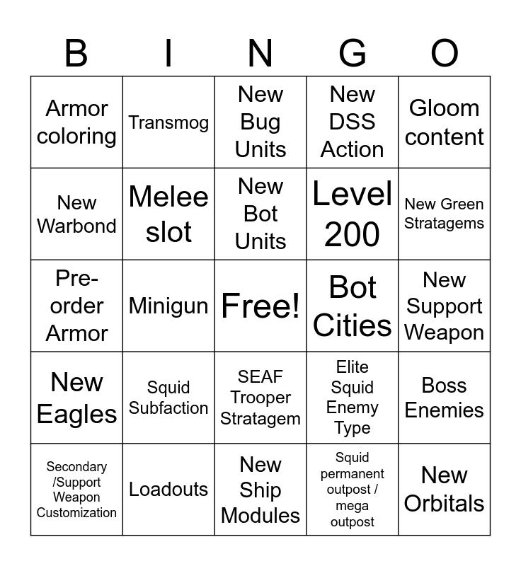 This bingo card has a free space and 24 words: Squid Subfaction, Loadouts, New Bot Units, Secondary /Support Weapon Customization, Gloom content, Armor coloring, New Warbond, Transmog, Bot Cities, SEAF Trooper Stratagem, Level 200, Pre-order Armor, Elite Squid Enemy Type, Boss Enemies, Melee slot, Squid permanent outpost / mega outpost, New Support Weapon, New Bug Units, New Green Stratagems, Minigun, New Orbitals, New Eagles, New DSS Action and New Ship Modules.