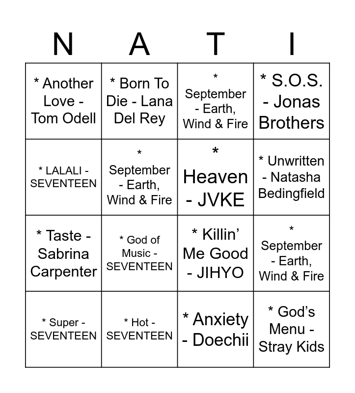 This bingo card has 48 words: * All Too Well (10 Minute Version) (Taylor's Version) (From The Vault) - Taylor Swift, * Super - SEVENTEEN, * Before The Storm (feat. Miley Cyrus) - Jonas Brothers, Miley Cyrus, * Shadow - SEVENTEEN, * Easy Lover - Miley Cyrus, * Red Lights (Bang Chan, Hyunjin) - Stray Kids, * Born To Die - Lana Del Rey, * Hot - SEVENTEEN, * September - Earth, Wind & Fire, * Only Human - Jonas Brothers, * Heaven - JVKE, * S.O.S. - Jonas Brothers, * Domine - Stray Kids, * Cruel Summer - Taylor Swift, * Getaway Car - Taylor Swift, * Murder On The Dancefloor - Sophie Ellis-Bextor, * Unwritten - Natasha Bedingfield, * Hot - SEVENTEEN, * Burnin' Up - Jonas Brothers, * LALALI - SEVENTEEN, * September - Earth, Wind & Fire, * Before The Storm (feat. Miley Cyrus) - Jonas Brothers, Miley Cyrus, * Another Love - Tom Odell, * Taste - Sabrina Carpenter, * Mind Over Matter (Reprise) - Young the Giant, * God of Music - SEVENTEEN, * The Man - Taylor Swift, * The Driveway - Miley Cyrus, * Angels Like You - Miley Cyrus, * God’s Menu - Stray Kids, * Boyfriend - Dove Cameron, * Murder On The Dancefloor - Sophie Ellis-Bextor, * God of Music - SEVENTEEN, * Make You Mine - Madison Beer, * Hot - SEVENTEEN, * The Man - Taylor Swift, * S.O.S. - Jonas Brothers, * Anxiety - Doechii, * August - Taylor Swift, * The Driveway - Miley Cyrus, * Mind Over Matter (Reprise) - Young the Giant, * Heaven - JVKE, * September - Earth, Wind & Fire, * Seven (feat. Latto) - Jung Kook, Latto, * Killin’ Me Good - JIHYO, * Easy Lover - Miley Cyrus, * Nothing Breaks Like a Heart (feat. Miley Cyrus) - Mark Ronson, Miley Cyrus and * Murder On The Dancefloor - Sophie Ellis-Bextor.