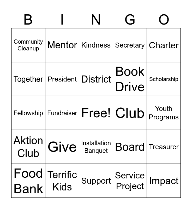 This bingo card has a free space and 49 words: Hope, Impact, Change, Support, Give, Inspire, Mentor, Empower, Together, Action, President, Secretary, Treasurer, Board, Division, Lieutenant Governor, District, Club, Member, Charter, Fundraiser, Service Project, Community Cleanup, Book Drive, Toy Drive, Scholarship, Food Bank, Meeting, Installation Banquet, Aktion Club, Key Club, Circle K, Builders Club, K-Kids, Terrific Kids, BUG (Bringing Up Grades), Read Around the World, Eliminate Project, Youth Programs, Service, Leadership, Integrity, Caring, Commitment, Fellowship, Kindness, Generosity, Volunteer and Citizenship.