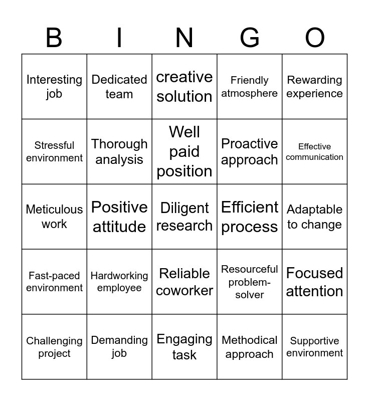 This bingo card has a free space and 24 words: Hardworking employee, Demanding job, Well paid position, Challenging project, Rewarding experience, Interesting job, Stressful environment, Dedicated team, Efficient process, Reliable coworker, Proactive approach, Meticulous work, Resourceful problem-solver, Focused attention, Thorough analysis, Methodical approach, Adaptable to change, creative solution, Effective communication, Positive attitude, Supportive environment, Fast-paced environment, Friendly atmosphere and Engaging task.