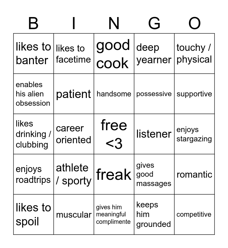 This bingo card has a free space and 24 words: athlete / sporty, muscular, handsome, likes to spoil, touchy / physical, likes to banter, enables his alien obsession, likes to facetime, listener, freak, possessive, likes drinking / clubbing, gives good massages, romantic, patient, keeps him grounded, enjoys stargazing, good cook, supportive, career oriented, competitive, enjoys roadtrips, deep yearner and gives him meaningful complimente.