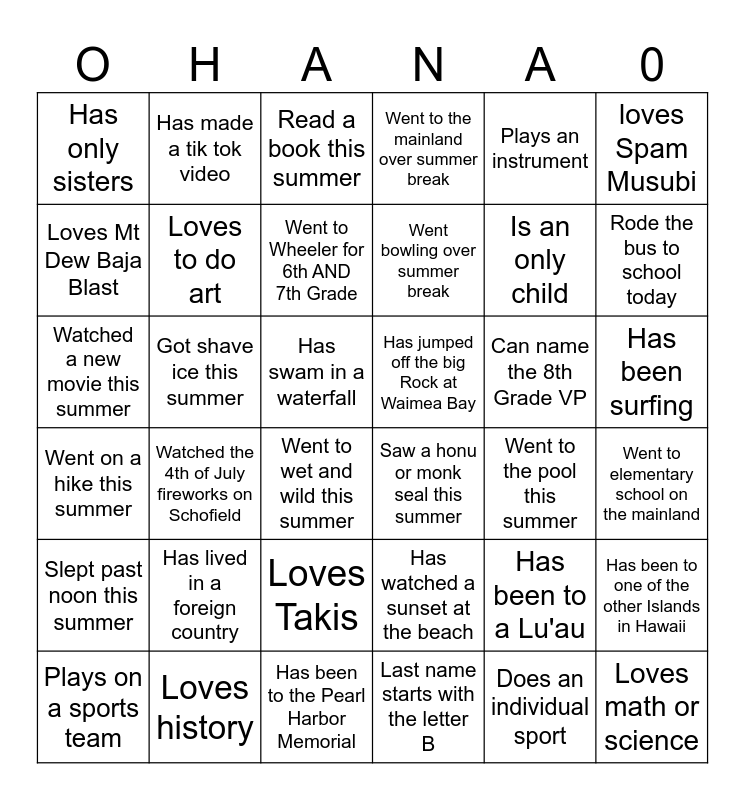 This bingo card has 36 words: Has watched a sunset at the beach, Loves Takis, Last name starts with the letter B, Loves Mt Dew Baja Blast, Went on a hike this summer, Has jumped off the big Rock at Waimea Bay, Loves to do art, Has been to the Pearl Harbor Memorial, Plays an instrument, Has been to a Lu'au, Rode the bus to school today, Went to the mainland over summer break, Has been to one of the other Islands in Hawaii, Got shave ice this summer, Went bowling over summer break, Has only sisters, Slept past noon this summer, Can name the 8th Grade VP, Watched a new movie this summer, Read a book this summer, Has swam in a waterfall, Watched the 4th of July fireworks on Schofield, Saw a honu or monk seal this summer, Went to wet and wild this summer, Went to the pool this summer, Has made a tik tok video, Is an only child, Loves history, Went to Wheeler for 6th AND 7th Grade, loves Spam Musubi, Loves math or science, Plays on a sports team, Went to elementary school on the mainland, Has been surfing, Has lived in a foreign country and Does an individual sport.