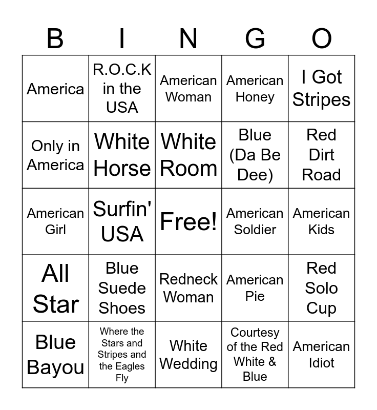This bingo card has a free space and 34 words: Party in the USA, Courtesy of the Red White & Blue, Blue Eyes crying in the rain, Red Red wine, All Star, White Horse, I Got Stripes, Blue Bayou, R.O.C.K in the USA, Blue ain't your color, White Room, American Woman, Blue, Video Killed the Radio Star, American Soldier, Red Dirt Road, Where the Stars and Stripes and the Eagles Fly, American Girl, Blue Suede Shoes, American Pie, Redneck Woman, White Rabbit, America, American Kids, White Wedding, American Idiot, American Honey, Born in the USA, Blue (Da Be Dee), Only in America, Red, Surfin' USA, Red Solo Cup and God Bless the USA.