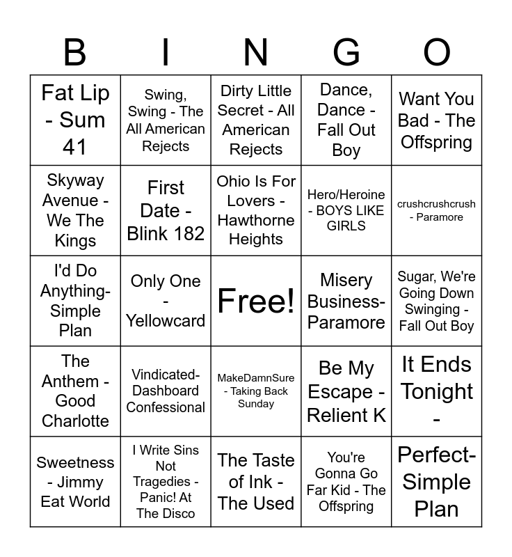 This bingo card has a free space and 41 words: Thnks fr th Mmrs - Fall Out Boy, Vindicated- Dashboard Confessional, Your Love is A Lie - Simple Plan, Misery Business- Paramore, Perfect- Simple Plan, The Anthem - Good Charlotte, Only One - Yellowcard, Check Yes Juliet - We The Kings, Hero/Heroine - BOYS LIKE GIRLS, It Ends Tonight -, Skyway Avenue - We The Kings, Swing, Swing - The All American Rejects, Be My Escape - Relient K, Sugar, We're Going Down Swinging - Fall Out Boy, I'd Do Anything- Simple Plan, I Write Sins Not Tragedies - Panic! At The Disco, Girls & Boys - Good Charlotte, Dance, Dance - Fall Out Boy, Hit Or Miss - New Found Glory, Fat Lip - Sum 41, Lifestyles of the Rich & Famous - Good Charlotte, The Taste of Ink - The Used, This Aint A Scene, It's An Arms Race - Fall Out Boy, Want You Bad - The Offspring, In This Diary - The Ataris, The Adventure - Angels & Airwaves, Ohio Is For Lovers - Hawthorne Heights, I'm Not Okay (I Promise) - My Chemical Romance, crushcrushcrush - Paramore, A Little Less Sixteen Candles, A Little, Welcome to the Black Parade - My Chemical Romance, Dirty Little Secret - All American Rejects, You're Gonna Go Far Kid - The Offspring, Cute Without 'E' (Cut From The Team) - Taking Back Sunday, Sweetness - Jimmy Eat World, First Date - Blink 182, MakeDamnSure - Taking Back Sunday, Last Resort - Papa Roach, Always - Blink 182, Hands Down - Dashboard Confessional and Move Along - The All American Rejects.