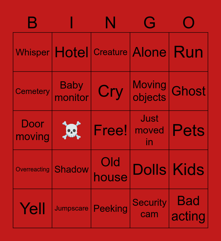 This bingo card has a free space and 24 words: Shadow, Jumpscare, Cry, Yell, Run, Whisper, Cemetery, Hotel, Just moved in, Old house, Moving objects, Door moving, Dolls, Kids, Baby monitor, Security cam, Pets, Creature, Ghost, ☠️, Bad acting, Overreacting, Alone and Peeking.