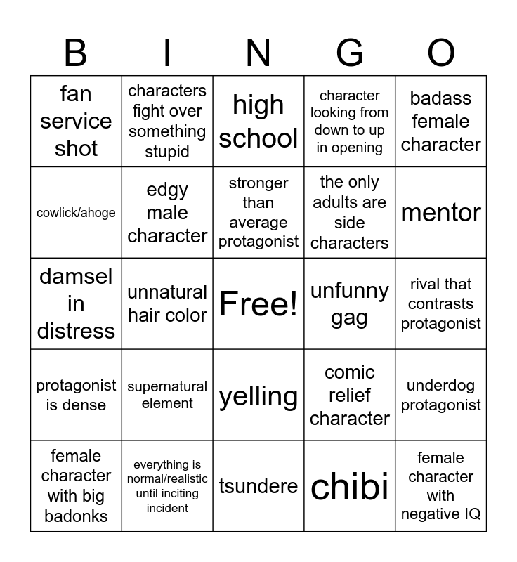This bingo card has a free space and 29 words: female character with big badonks, male character with spiky hair, unnatural hair color, dead relative, fan service shot, high school, edgy male character, supernatural element, unfunny gag, everything is normal/realistic until inciting incident, rival that contrasts protagonist, female character with negative IQ, tsundere, chibi, mentor, protagonist has a special advantage over others, yelling, protagonist is dense, badass female character, damsel in distress, comic relief character, pretty boy, the only adults are side characters, cowlick/ahoge, character looking from down to up in opening, characters fight over something stupid, underdog protagonist, stronger than average protagonist and power up scene.