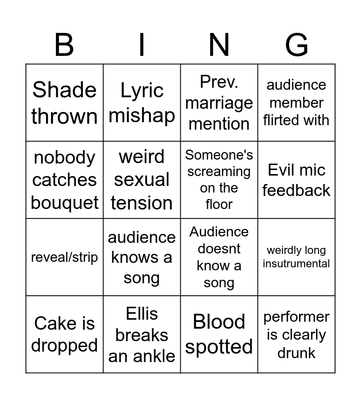 This bingo card has 21 words: Ellis breaks an ankle, Prop breaks, Lyric mishap, Polyamory mention, Blood spotted, Someone's screaming on the floor, Shade thrown, Prev. marriage mention, Audience doesnt know a song, Evil mic feedback, reveal/strip, audience member flirted with, performer is clearly drunk, Part of set is broken, weird sexual tension, Ellis mentions his kids, Cake is dropped, audience knows a song, nobody catches bouquet, weirdly long insutrumental and ellis twists ankle.
