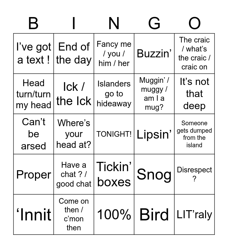 This bingo card has a free space and 34 words: Bombshell, Bird, Mad / it’s mad / movin mad, Graft / grafting boots, Proper, Ick / the Ick, The craic / what’s the craic / craic on, ‘Innit, End of the day, Islanders goes to terrace, Islanders go to hideaway, Fancy me / you / him / her, Banter, It is what it is, Lipsin’, It’s not that deep, Come on then / c’mon then, Can’t be arsed, Have a chat ? / good chat, Snog, Tickin’ boxes, Closed off, I’ve got a text !, Someone gets dumped from the island, 100%, LIT’raly, Buzzin’, Have a type / what’s your type?, Muggin’ / muggy / am I a mug?, Head turn/turn my head, Cuddle, Where’s your head at?, Disrespect ? and Triangle.