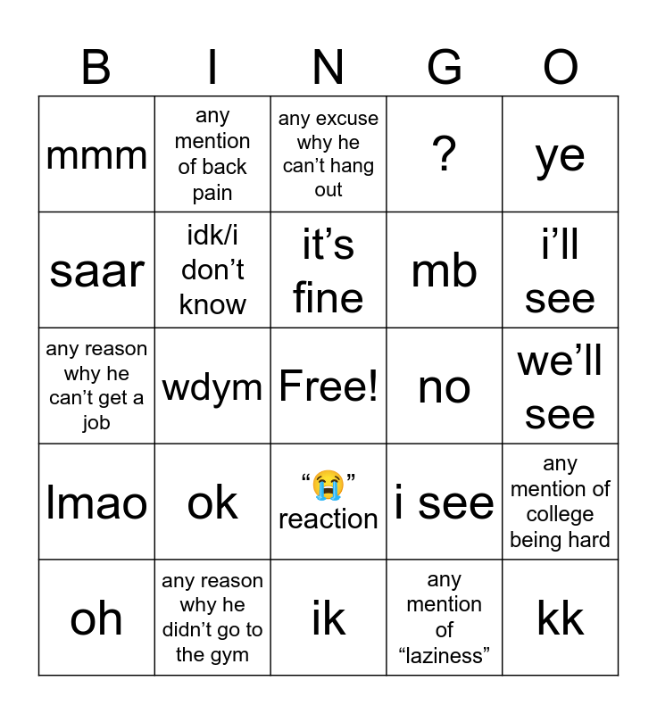 This bingo card has a free space and 39 words: “i’ll do my best”, yes, “👍” reaction, idk/i don’t know, oh, “😭” reaction, it’s fine, lol, ye, lmao, wdym, ?, kk, we’ll see, no, ok, “?” reaction, mmm, kinda, i see, saar, ik, mb, i’ll see, anything “djinn” related, anything “islam” related(djinns don’t count), admitted to “gooning” again, any question relating to “women” also hanging out, anything “weight” related, any mention of back pain, asking if we’ve seen a trailer, asking if we’re gonna play a video game, any excuse why he can’t hang out, any reason why he didn’t go to the gym, any mention of “laziness”, excuse why he can’t go for a walk, any mention of college being hard, any reason why he can’t get a job and “what do/does (name/he/you) want me to say?”.