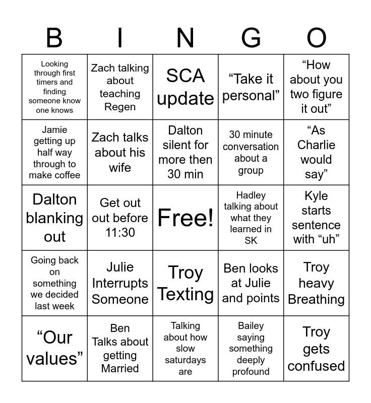 This bingo card has a free space and 24 words: Julie Interrupts Someone, Ben Talks about getting Married, Dalton silent for more then 30 min, “Our values”, “How about you two figure it out”, Looking through first timers and finding someone know one knows, Jamie getting up half way through to make coffee, Zach talking about teaching Regen, Hadley talking about what they learned in SK, Troy Texting, 30 minute conversation about a group, Dalton blanking out, Ben looks at Julie and points, Troy heavy Breathing, Zach talks about his wife, Bailey saying something deeply profound, Kyle starts sentence with “uh”, SCA update, “As Charlie would say”, Get out out before 11:30, Troy gets confused, Going back on something we decided last week, “Take it personal” and Talking about how slow saturdays are.