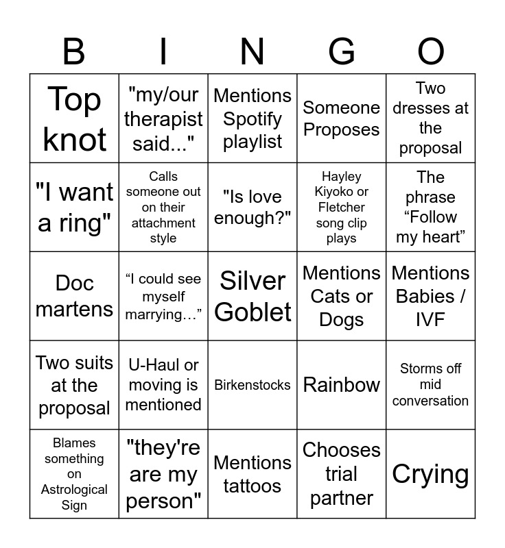 This bingo card has a free space and 29 words: Blames something on Astrological Sign, Oxtail, “I could see myself marrying…”, Talking about forever, Top knot, Mentions Spotify playlist, Calls someone out on their attachment style, U-Haul or moving is mentioned, Mentions Cats or Dogs, "they're are my person", Mentions Babies / IVF, Crying, Mentions tattoos, Chooses trial partner, The phrase “Follow my heart”, One partner wants to do ENM, Birkenstocks, Two suits at the proposal, Two dresses at the proposal, Doc martens, Rainbow, Host calls it a "social experiment", Hayley Kiyoko or Fletcher song clip plays, "I want a ring", Someone Proposes, "my/our therapist said...", Storms off mid conversation, "Is love enough?" and shares coming out story.