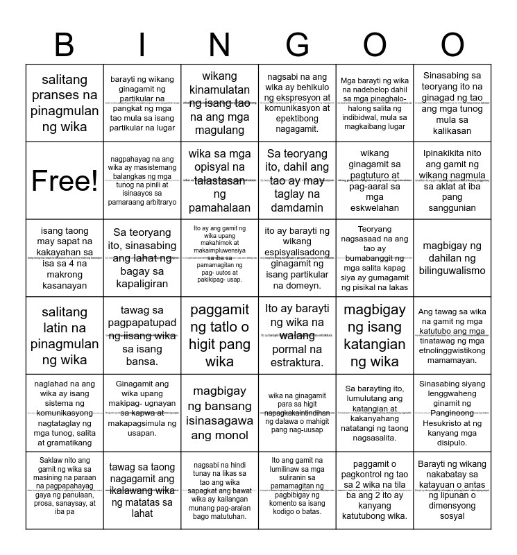 This bingo card has 29 images and 36 words: salitang latin na pinagmulan ng wika, tawag sa pagpapatupad ng iisang wika sa isang bansa., nagsabi na hindi tunay na likas sa tao ang wika sapagkat ang bawat wika ay kailangan munang pag-aralan bago matutuhan., Sa teoryang ito, dahil ang tao ay may taglay na damdamin, Teoryang nagsasaad na ang tao ay bumabanggit ng mga salita kapag siya ay gumagamit ng pisikal na lakas, magbigay ng dahilan ng bilinguwalismo, salitang pranses na pinagmulan ng wika, tawag sa taong nagagamit ang ikalawang wika ng matatas sa lahat, wikang kinamulatan ng isang tao na ang mga magulang, wika na ginagamit para sa higit napagkakaintindihan ng dalawa o mahigit pang nag-uusap, wikang ginagamit sa pagtuturo at pag-aaral sa mga eskwelahan, Sinasabing sa teoryang ito na ginagad ng tao ang mga tunog mula sa kalikasan, naglahad na ang wika ay isang sistema ng komunikasyong nagtataglay ng mga tunog, salita at gramatikang, Sa teoryang ito, sinasabing ang lahat ng bagay sa kapaligiran, wika sa mga opisyal na talastasan ng pamahalaan, nagsabi na ang wika ay behikulo ng ekspresyon at komunikasyon at epektibong nagagamit., Sa barayting ito, lumulutang ang katangian at kakanyahang natatangi ng taong nagsasalita., Ang tawag sa wika na gamit ng mga katutubo ang mga tinatawag ng mga etnolinggwistikong mamamayan., Free!, nagpahayag na ang wika ay masistemang balangkas ng mga tunog na pinili at isinaayos sa pamaraang arbitraryo, paggamit ng tatlo o higit pang wika, Ito ay barayti ng wika na walang pormal na estraktura., magbigay ng isang katangian ng wika, Sinasabing siyang lenggwaheng ginamit ng Panginoong Hesukristo at ng kanyang mga disipulo., isang taong may sapat na kakayahan sa isa sa 4 na makrong kasanayan, barayti ng wikang ginagamit ng partikular na pangkat ng mga tao mula sa isang partikular na lugar, Ito ay ang gamit ng wika upang makahimok at makaimpluwensiya sa iba sa pamamagitan ng pag- uutos at pakikipag- usap., Ito ang gamit na lumilinaw sa mga suliranin sa pamamagitan ng pagbibigay ng komento sa isang kodigo o batas., Mga barayti ng wika na nadebelop dahil sa mga pinaghalo-halong salita ng indibidwal, mula sa magkaibang lugar, Ipinakikita nito ang gamit ng wikang nagmula sa aklat at iba pang sanggunian, Saklaw nito ang gamit ng wika sa masining na paraan na pagpapahayag gaya ng panulaan, prosa, sanaysay, at iba pa, Ginagamit ang wika upang makipag- ugnayan sa kapwa at makapagsimula ng usapan., magbigay ng bansang isinasagawa ang monol, ito ay barayti ng wikang espisyalisadong ginagamit ng isang partikular na domeyn., paggamit o pagkontrol ng tao sa 2 wika na tila ba ang 2 ito ay kanyang katutubong wika. and Barayti ng wikang nakabatay sa katayuan o antas ng lipunan o dimensyong sosyal.