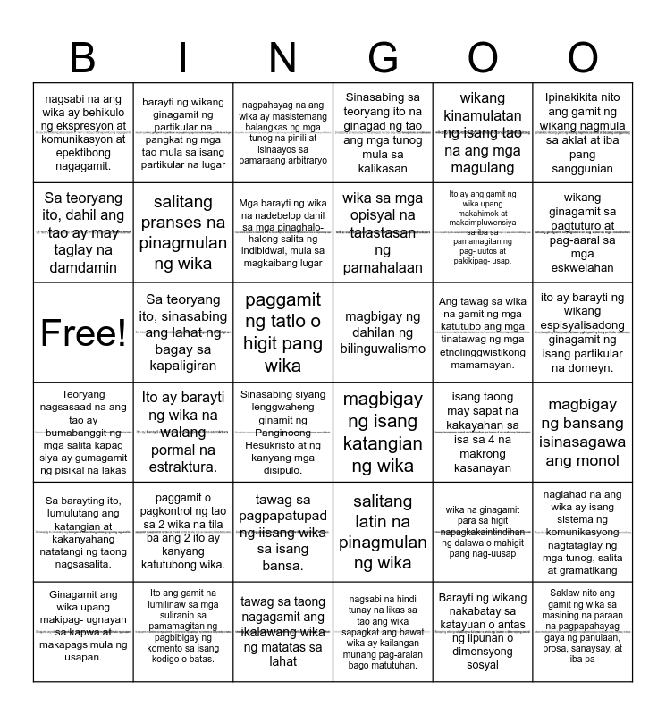 This bingo card has 29 images and 36 words: salitang latin na pinagmulan ng wika, tawag sa pagpapatupad ng iisang wika sa isang bansa., nagsabi na hindi tunay na likas sa tao ang wika sapagkat ang bawat wika ay kailangan munang pag-aralan bago matutuhan., Sa teoryang ito, dahil ang tao ay may taglay na damdamin, Teoryang nagsasaad na ang tao ay bumabanggit ng mga salita kapag siya ay gumagamit ng pisikal na lakas, magbigay ng dahilan ng bilinguwalismo, salitang pranses na pinagmulan ng wika, tawag sa taong nagagamit ang ikalawang wika ng matatas sa lahat, wikang kinamulatan ng isang tao na ang mga magulang, wika na ginagamit para sa higit napagkakaintindihan ng dalawa o mahigit pang nag-uusap, wikang ginagamit sa pagtuturo at pag-aaral sa mga eskwelahan, Sinasabing sa teoryang ito na ginagad ng tao ang mga tunog mula sa kalikasan, naglahad na ang wika ay isang sistema ng komunikasyong nagtataglay ng mga tunog, salita at gramatikang, Sa teoryang ito, sinasabing ang lahat ng bagay sa kapaligiran, wika sa mga opisyal na talastasan ng pamahalaan, nagsabi na ang wika ay behikulo ng ekspresyon at komunikasyon at epektibong nagagamit., Sa barayting ito, lumulutang ang katangian at kakanyahang natatangi ng taong nagsasalita., Ang tawag sa wika na gamit ng mga katutubo ang mga tinatawag ng mga etnolinggwistikong mamamayan., Free!, nagpahayag na ang wika ay masistemang balangkas ng mga tunog na pinili at isinaayos sa pamaraang arbitraryo, paggamit ng tatlo o higit pang wika, Ito ay barayti ng wika na walang pormal na estraktura., magbigay ng isang katangian ng wika, Sinasabing siyang lenggwaheng ginamit ng Panginoong Hesukristo at ng kanyang mga disipulo., isang taong may sapat na kakayahan sa isa sa 4 na makrong kasanayan, barayti ng wikang ginagamit ng partikular na pangkat ng mga tao mula sa isang partikular na lugar, Ito ay ang gamit ng wika upang makahimok at makaimpluwensiya sa iba sa pamamagitan ng pag- uutos at pakikipag- usap., Ito ang gamit na lumilinaw sa mga suliranin sa pamamagitan ng pagbibigay ng komento sa isang kodigo o batas., Mga barayti ng wika na nadebelop dahil sa mga pinaghalo-halong salita ng indibidwal, mula sa magkaibang lugar, Ipinakikita nito ang gamit ng wikang nagmula sa aklat at iba pang sanggunian, Saklaw nito ang gamit ng wika sa masining na paraan na pagpapahayag gaya ng panulaan, prosa, sanaysay, at iba pa, Ginagamit ang wika upang makipag- ugnayan sa kapwa at makapagsimula ng usapan., magbigay ng bansang isinasagawa ang monol, ito ay barayti ng wikang espisyalisadong ginagamit ng isang partikular na domeyn., paggamit o pagkontrol ng tao sa 2 wika na tila ba ang 2 ito ay kanyang katutubong wika. and Barayti ng wikang nakabatay sa katayuan o antas ng lipunan o dimensyong sosyal.