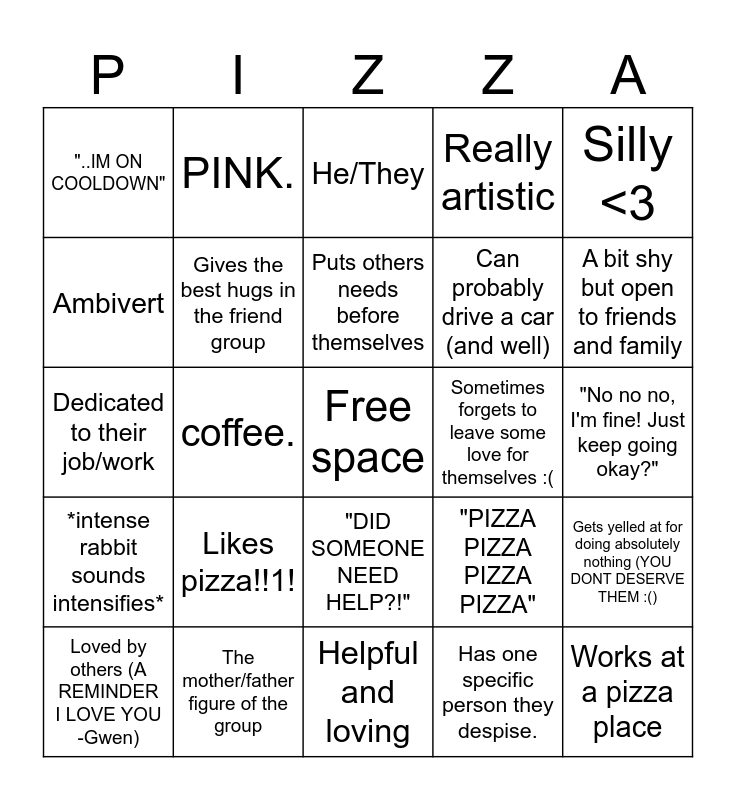 This bingo card has a free space and 24 words: Likes pizza!!1!, The mother/father figure of the group, Puts others needs before themselves, Loved by others (A REMINDER I LOVE YOU -Gwen), Silly <3, "..IM ON COOLDOWN", Ambivert, PINK., Sometimes forgets to leave some love for themselves :(, "DID SOMEONE NEED HELP?!", Can probably drive a car (and well), Dedicated to their job/work, "PIZZA PIZZA PIZZA PIZZA", Gets yelled at for doing absolutely nothing (YOU DONT DESERVE THEM :(), Gives the best hugs in the friend group, Has one specific person they despise., "No no no, I'm fine! Just keep going okay?", He/They, A bit shy but open to friends and family, coffee., Works at a pizza place, *intense rabbit sounds intensifies*, Really artistic and Helpful and loving.