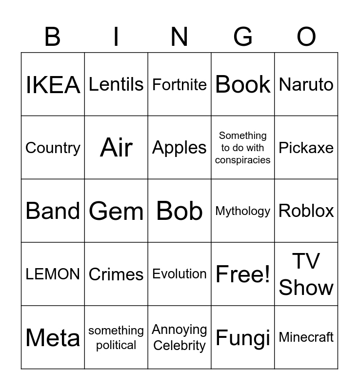 This bingo card has 25 words: Crimes, Annoying Celebrity, Apples, Meta, Naruto, IKEA, Country, Lentils, Mythology, Evolution, Something to do with conspiracies, Band, Free!, TV Show, Air, Minecraft, Roblox, Fortnite, Pickaxe, Gem, Bob, something political, LEMON, Book and Fungi.