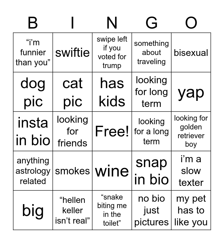 This bingo card has a free space and 24 words: smokes, “hellen keller isn’t real”, has kids, big, bisexual, “i’m funnier than you”, dog pic, swiftie, looking for a long term, wine, looking for long term, insta in bio, snap in bio, i’m a slow texter, cat pic, no bio just pictures, looking for golden retriever boy, swipe left if you voted for trump, yap, looking for friends, my pet has to like you, anything astrology related, something about traveling and “snake biting me in the toilet”.