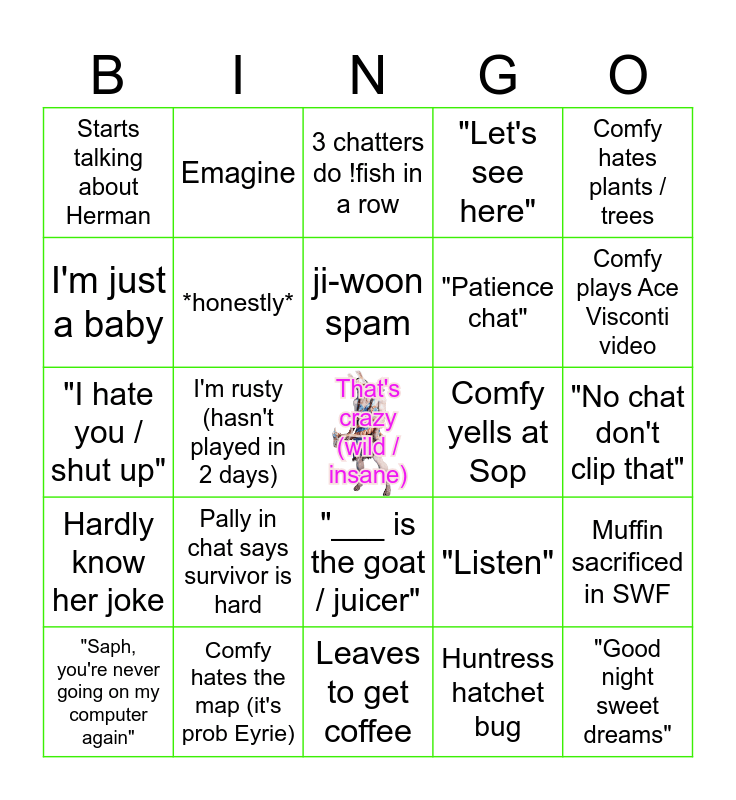 This bingo card has a free space and 34 words: We gotta watch them leave chat?, Huntress hatchet bug, *dude*, Comfy hates Feng, Hardly know her joke, *honestly*, Comfy hates plants / trees, "Saph, you're never going on my computer again", Emagine, "That should've hit", ji-woon spam, 3 chatters do !fish in a row, Mein gott, "I'm not a Trickster main", Comfy yells at Sop, Comfy plays Ace Visconti video, Comfy hates the map (it's prob Eyrie), "I hate you / shut up", Pally in chat says survivor is hard, "Listen", "___ is the goat / juicer", "Reee", Starts talking about Herman, "No chat don't clip that", Leaves to get coffee, "Good night sweet dreams", "Let's see here", "I swear" (to God), "Patience chat", I'm just a baby, Starts talking about Pear, I'm rusty (hasn't played in 2 days), Muffin sacrificed in SWF and Naur / naur Cleo.
