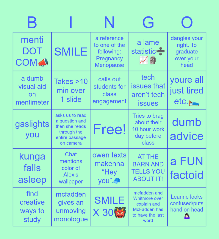 This bingo card has a free space and 24 words: Chat mentions color of Alex’s wallpaper, mcfadden gives an unmoving monologue, calls out students for class engagement, find creative ways to study, dangles your right. To graduate over your head, menti DOT COM📣, a dumb visual aid on mentimeter, SMILE, Tries to brag about their 10 hour work day before class, owen texts makenna “Hey you”🧢, tech issues that aren’t tech issues, gaslights you, AT THE BARN AND TELLS YOU ABOUT IT!, a FUN factoid, Takes >10 min over 1 slide, mcfadden and Whitmore over explain and McFadden has to have the last word, dumb advice, a reference to one of the following: Pregnancy Menopause, youre all just tired etc.🛌, asks us to read a question and then she reads through the entire passage on camera, Leanne looks confused/puts hand on head🤷🏻♀️, kunga falls asleep, a lame statistic➗📈🗿 and SMILE X 30👹.