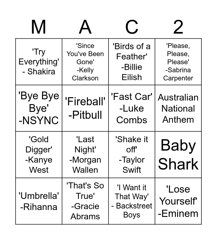 This bingo card has 20 words: Baby Shark, Simpsons Theme Song, 'Birds of a Feather' -Billie Eilish, 'Dancing Queen' -ABBA, 'Umbrella' -Rihanna, 'Bye Bye Bye' -NSYNC, 'That's So True' -Gracie Abrams, 'Try Everything' - Shakira, 'Gold Digger' -Kanye West, 'Since You've Been Gone' -Kelly Clarkson, 'Last Night' -Morgan Wallen, 'Shake it off' -Taylor Swift, 'Fireball' -Pitbull, 'Lose Yourself' -Eminem, 'Fast Car' -Luke Combs, 'We Will Rock You' -Queen, Australian National Anthem, 'Please, Please, Please' -Sabrina Carpenter, 'I Want it That Way' - Backstreet Boys and 'Beautiful Things' -Benson Boone.