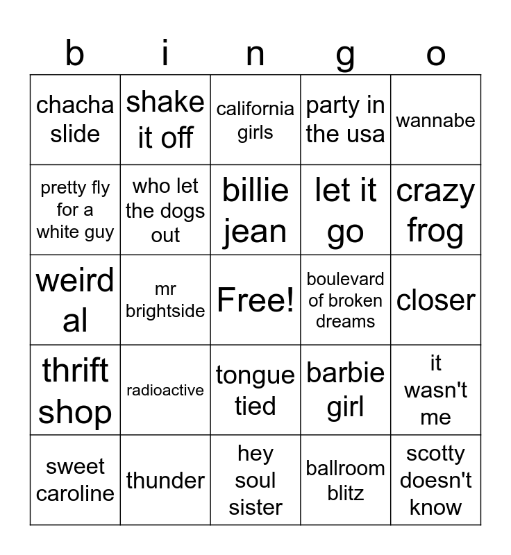 This bingo card has a free space and 56 words: don't stop believing, sweet caroline, i write sins, chacha slide, hey soul sister, ymca, who let the dogs out, pocketful full of sunshine, let it go, uptown funk, party in the usa, come on eileen, bohemian rhapsody, living on a prayer, ice ice baby, 500 miles, wannabe, mr brightside, stacy's mom, scotty doesn't know, boulevard of broken dreams, thanks for the memories, barbie girl, california girls, footloose, billie jean, single ladies, another one bites the dust, crazy frog, venga bus, sabotage, tubthumping, stronger, oops i did it again, closer, pretty fly for a white guy, weird al, you're gonna go far kid, thrift shop, shake it off, tongue tied, basketcase, kids by mgmt, do i wanna know, we are young, radioactive, thunder, kingdom come, who can it be now, pump up the jam, ballroom blitz, kung fu fighting, fergalicious, i gotta feelin, it wasn't me and check yes juliet.