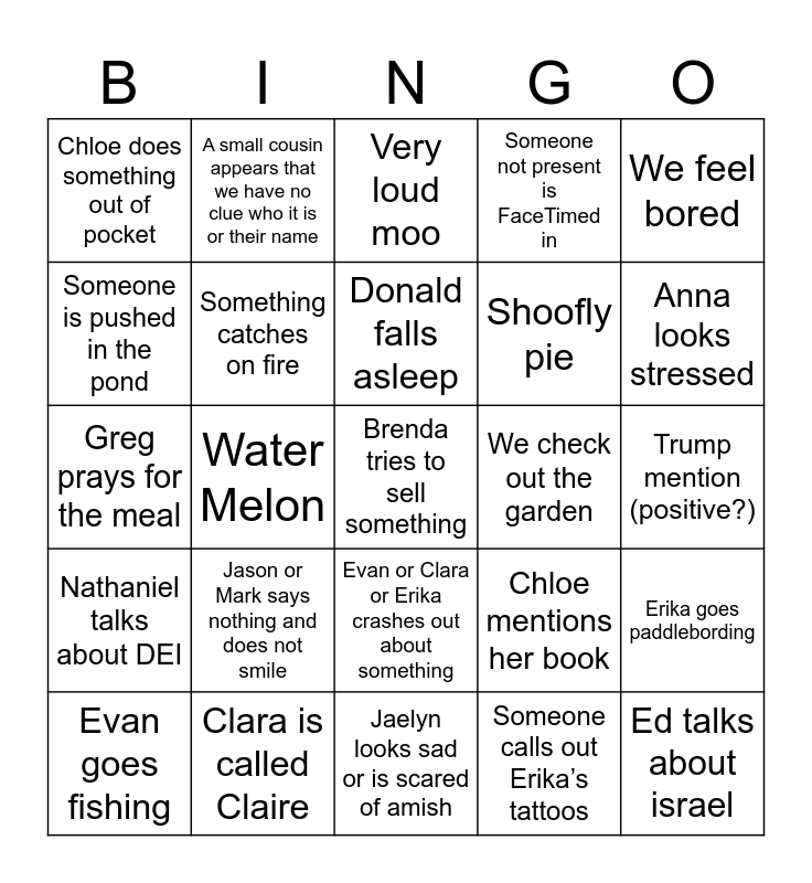 This bingo card has a free space and 24 words: Jason or Mark says nothing and does not smile, Clara is called Claire, Donald falls asleep, Evan goes fishing, We feel bored, Chloe does something out of pocket, Someone is pushed in the pond, A small cousin appears that we have no clue who it is or their name, We check out the garden, Evan or Clara or Erika crashes out about something, Shoofly pie, Greg prays for the meal, Chloe mentions her book, Erika goes paddlebording, Something catches on fire, Someone calls out Erika’s tattoos, Trump mention (positive?), Very loud moo, Anna looks stressed, Water Melon, Ed talks about israel, Nathaniel talks about DEI, Someone not present is FaceTimed in and Jaelyn looks sad or is scared of amish.