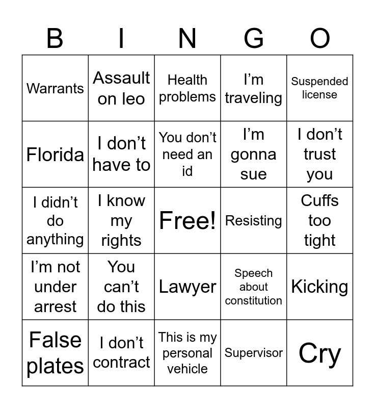 This bingo card has a free space and 24 words: You can’t do this, I don’t contract, You don’t need an id, False plates, Suspended license, Warrants, Florida, Assault on leo, Resisting, Lawyer, I’m gonna sue, I didn’t do anything, Speech about constitution, Kicking, I don’t have to, Supervisor, Cuffs too tight, Health problems, I don’t trust you, I know my rights, Cry, I’m not under arrest, I’m traveling and This is my personal vehicle.