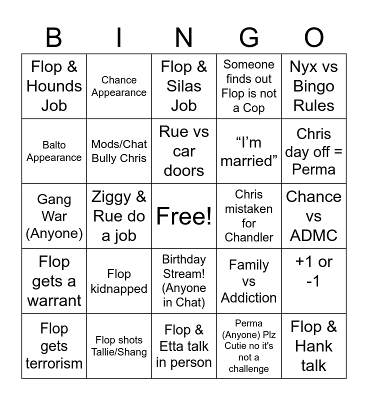 This bingo card has a free space and 30 words: Flop shots Tallie/Shang, Buggs-Dugong vs ADMC, Ziggy & Rue do a job, Flop/Ziggy talk to Sean, Flop & Hounds Job, Flop & Silas Job, Mods/Chat Bully Chris, Birthday Stream! (Anyone in Chat), Chris mistaken for Chandler, Flop & Etta talk in person, Chance vs ADMC, Flop & Hank talk, Perma (Anyone) Plz Cutie no it's not a challenge, ICU (Anyone), Chris day off = Perma, Food Takes [Good/Bad], Family vs Addiction, Flop gets a warrant, Flop kidnapped, Nyx vs Bingo Rules, Gang War (Anyone), Flop roles an 11, Chance Appearance, “I’m married”, Balto Appearance, Someone finds out Flop is not a Cop, +1 or -1, Flop gets terrorism, Rue vs car doors and Flop Karen against PD.
