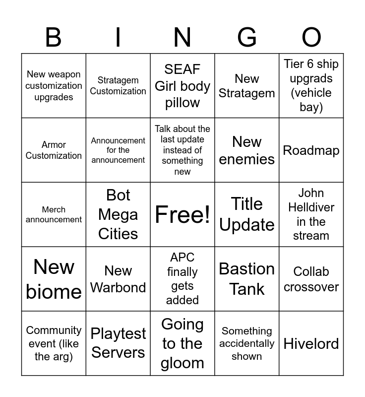 This bingo card has a free space and 24 words: New Warbond, Playtest Servers, Talk about the last update instead of something new, Community event (like the arg), Tier 6 ship upgrads (vehicle bay), New weapon customization upgrades, Armor Customization, Stratagem Customization, Title Update, APC finally gets added, New enemies, Merch announcement, Bastion Tank, Collab crossover, Announcement for the announcement, Something accidentally shown, John Helldiver in the stream, SEAF Girl body pillow, Roadmap, Bot Mega Cities, Hivelord, New biome, New Stratagem and Going to the gloom.