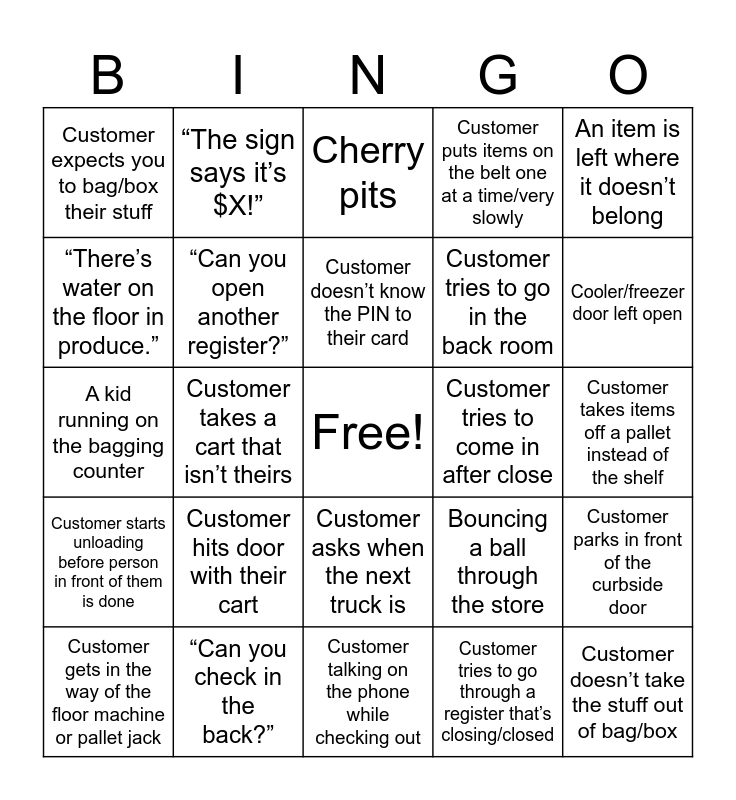 This bingo card has a free space and 24 words: Customer hits door with their cart, “Can you check in the back?”, Customer doesn’t know the PIN to their card, Customer gets in the way of the floor machine or pallet jack, An item is left where it doesn’t belong, Customer expects you to bag/box their stuff, “There’s water on the floor in produce.”, “The sign says it’s $X!”, Customer tries to come in after close, Customer asks when the next truck is, Customer tries to go in the back room, A kid running on the bagging counter, Bouncing a ball through the store, Customer parks in front of the curbside door, “Can you open another register?”, Customer tries to go through a register that’s closing/closed, Customer takes items off a pallet instead of the shelf, Cherry pits, Cooler/freezer door left open, Customer takes a cart that isn’t theirs, Customer doesn’t take the stuff out of bag/box, Customer starts unloading before person in front of them is done, Customer puts items on the belt one at a time/very slowly and Customer talking on the phone while checking out.