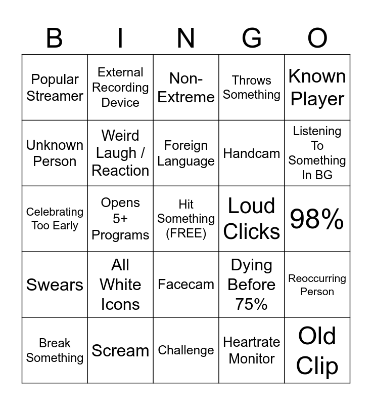 This bingo card has a free space and 24 words: All White Icons, Scream, Foreign Language, Break Something, Known Player, Popular Streamer, Unknown Person, External Recording Device, Loud Clicks, Facecam, Handcam, Celebrating Too Early, Dying Before 75%, Reoccurring Person, Weird Laugh / Reaction, Heartrate Monitor, 98%, Non-Extreme, Listening To Something In BG, Opens 5+ Programs, Old Clip, Swears, Throws Something and Challenge.