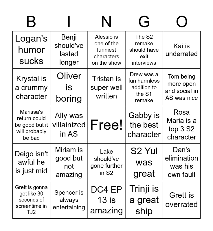 This bingo card has a free space and 24 words: Miriam is good but not amazing, Spencer is always entertaining, Tristan is super well written, Grett is gonna get like 30 seconds of screentime in TJ2, Kai is underrated, Logan's humor sucks, Krystal is a crummy character, Benji should've lasted longer, Gabby is the best character, Lake should've gone further in S2, Drew was a fun harmless addition to the S1 remake, Marissa's return could be good but it will probably be bad, S2 Yul was great, Dan's elimination was his own fault, Oliver is boring, Trinji is a great ship, Rosa Maria is a top 3 S2 character, Alessio is one of the funniest characters on the show, Tom being more open and social in AS was nice, Ally was villainized in AS, Grett is overrated, Deigo isn't awful he is just mid, The S2 remake should have exit interviews and DC4 EP 13 is amazing.