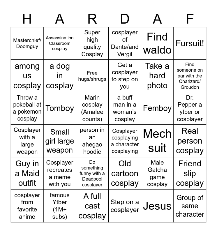 This bingo card has 39 words: famous Ytber (1M+ subs), cosplayer from favorite anime, See someone holding nsfw body pillow, among us cosplay, person in an ahegao hoodie, Dr. Pepper a ytber or cosplayer, a dog in cosplay, Group of same character, Find waldo, a buff man in a woman’s cosplay, Find someone on par with the Charizard/ Groudon, cosplayer of Dante/and Vergil, Throw a pokeball at a pokemon cosplay, Marin cosplay (Amalee counts), Tomboy, Femboy, Male Gatcha game cosplay, Masterchief/ Doomguy, A full cast cosplay, Cosplayer with a large weapon, Fursuit!, Mech suit, Free hugs/shrugs, Get a cosplayer to step on you, Step on a cosplayer, Do something funny with a Deadpool cosplayer, Guy in a Maid outfit, Jesus, Cosplayer recreates a meme with you, Assassination Classroom cosplay, Find a vtuber, Friend slip cosplay, Super high quality Cosplay, Cosplayer cosplaying a character cosplaying, Real person cosplay, Old cartoon cosplay, Small girl large weapon, Take a hard photo and Deltarune ch 3+4 cosplay.