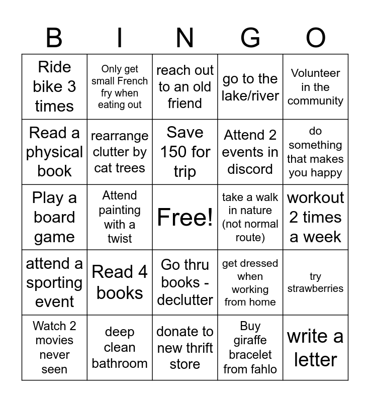 This bingo card has a free space and 24 words: Read 4 books, deep clean bathroom, Save 150 for trip, Watch 2 movies never seen, Volunteer in the community, Ride bike 3 times, Read a physical book, Only get small French fry when eating out, take a walk in nature (not normal route), Go thru books - declutter, Attend 2 events in discord, Play a board game, get dressed when working from home, try strawberries, rearrange clutter by cat trees, Buy giraffe bracelet from fahlo, workout 2 times a week, reach out to an old friend, do something that makes you happy, Attend painting with a twist, write a letter, attend a sporting event, go to the lake/river and donate to new thrift store.