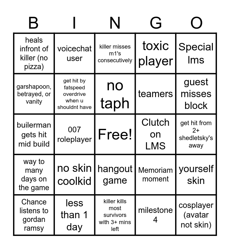 This bingo card has a free space and 24 words: Chance listens to gordan ramsy, no skin coolkid, no taph, milestone 4, Special lms, heals infront of killer (no pizza), voicechat user, killer misses m1's consecutively, Clutch on LMS, get hit from 2+ shedletsky's away, builerman gets hit mid build, get hit by fatspeed overdrive when u shouldnt have, Memoriam moment, yourself skin, garshapoon, betrayed, or vanity, less than 1 day, killer kills most survivors with 3+ mins left, toxic player, guest misses block, way to many days on the game, 007 roleplayer, hangout game, teamers and cosplayer (avatar not skin).