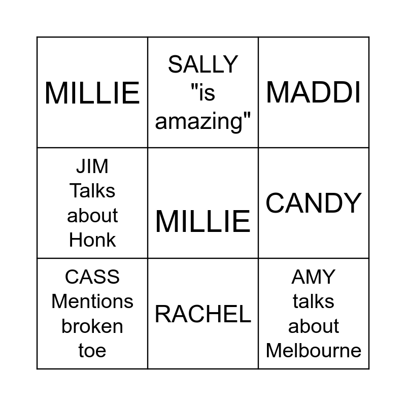 This bingo card has a free space and 14 words: DAVE "hello my friend", TOM Shadow bats, CASS Mentions broken toe, SALLY "is amazing", JIM Talks about Honk, AMY talks about Melbourne, AMANDA, GEORGE, RACHEL, MILLIE, MICHAEL, CANDY, MADDI and SARA.